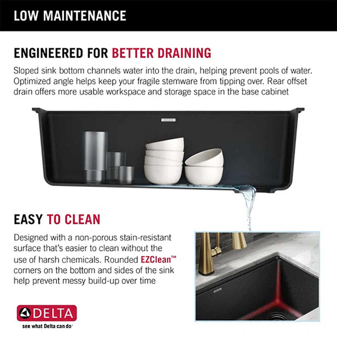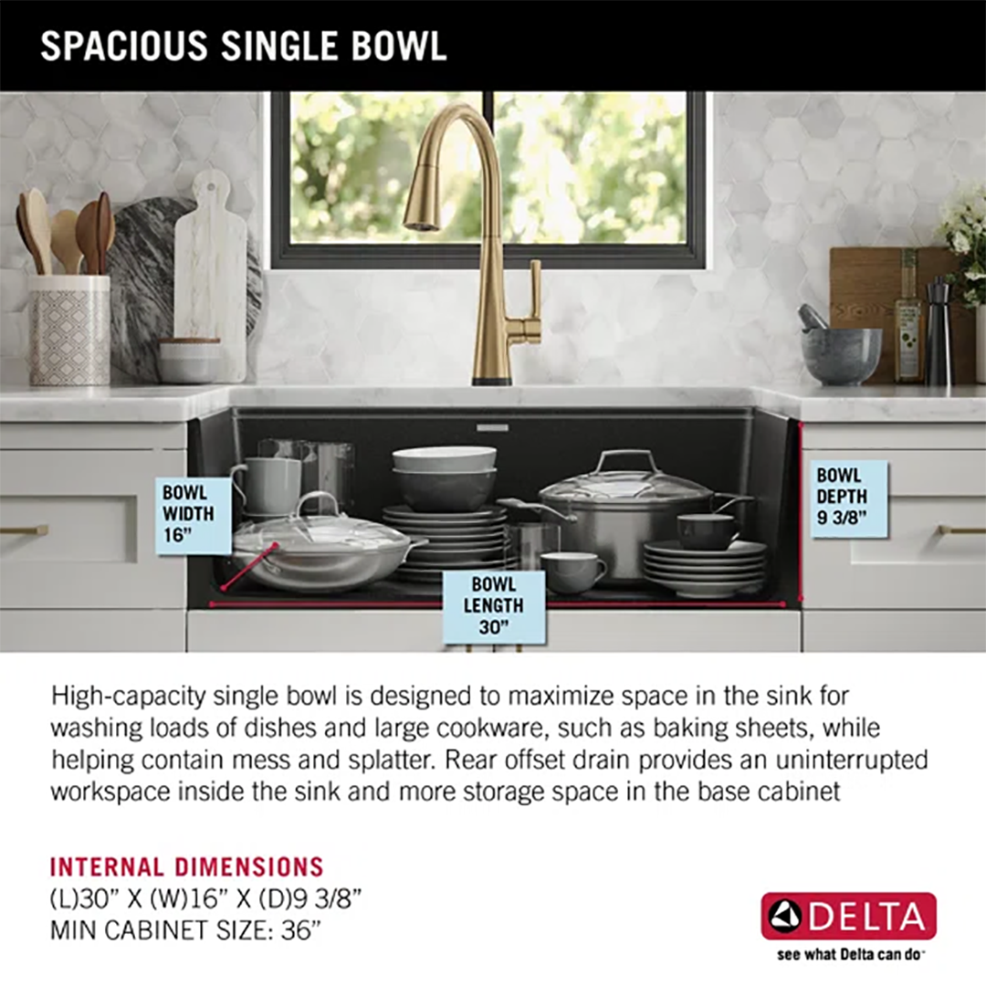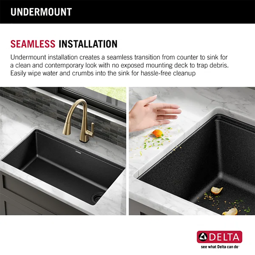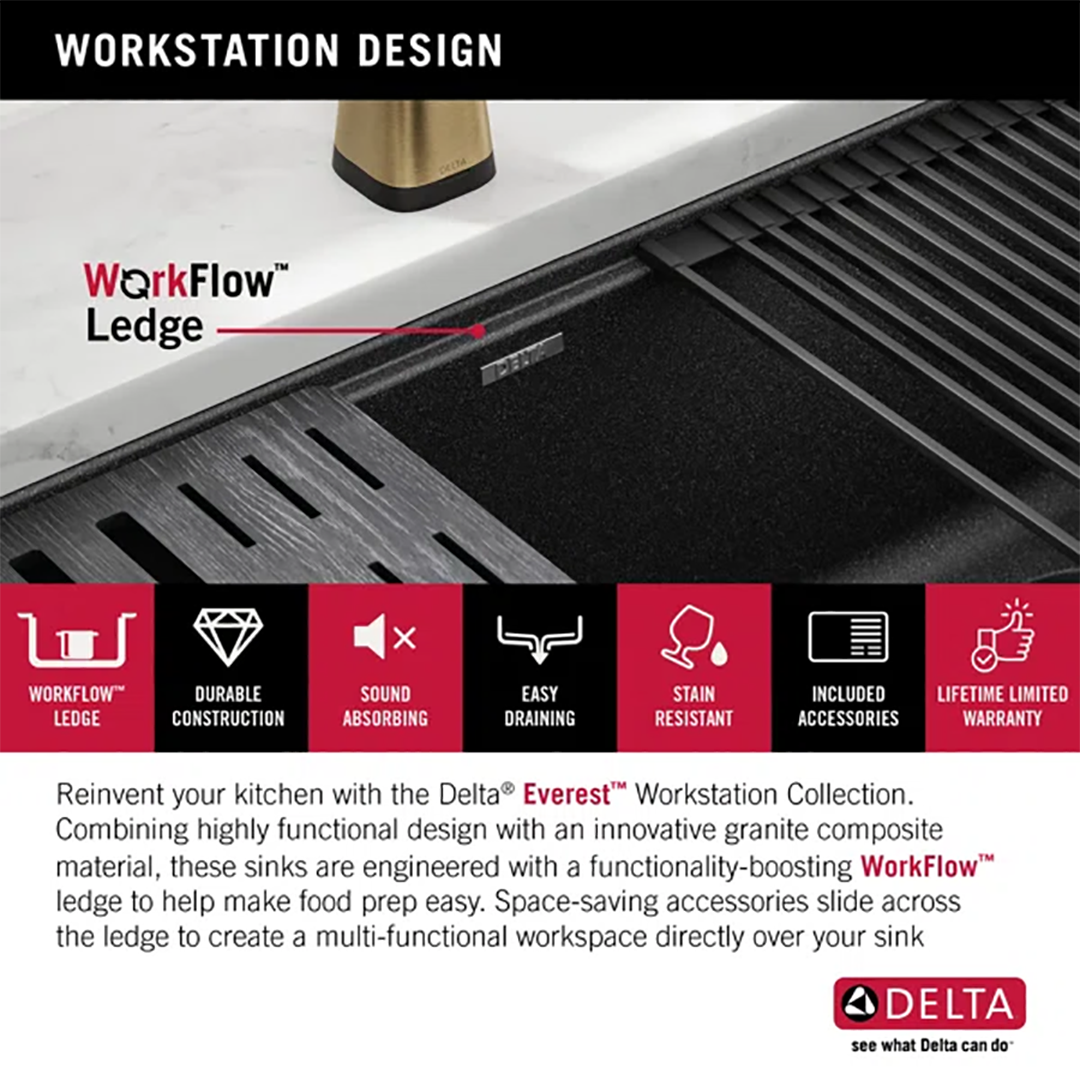 Upgrade your kitchen with the Delta Everest™ 32" Granite Composite Workstation Sink, combining durability, style, and smart functionality. Crafted from a tough granite composite, it’s resistant to scratches, stains, chips, and heat, making it perfect for busy kitchens.
